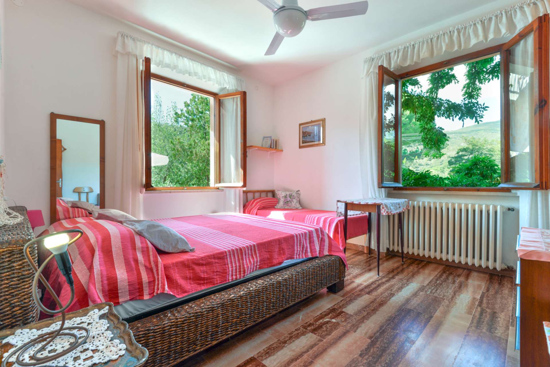Al piano terra rialzato della villa, con sotto le cantine, l’appartamento La Bouganvillae è 98 mq ed è davvero comodo per 8 ospiti grazie allo spazio attrezzato per mangiare fuori e stare in relax subito fuori dal portoncino, i due balconi e le camere ampie.